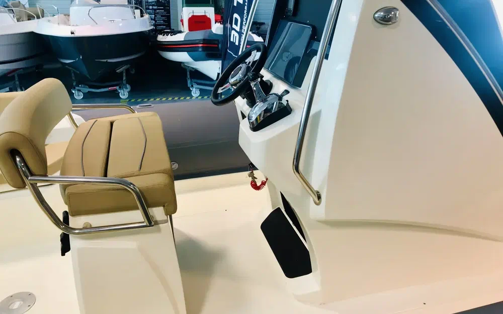 avec son sondeur / GPS couleur 5 avec cartographie , son équipement de securite de moins de 6 m et son kit cordage / mouillage / pare battage