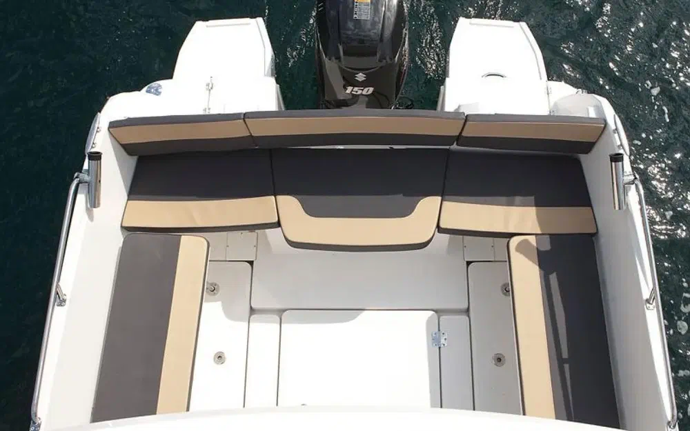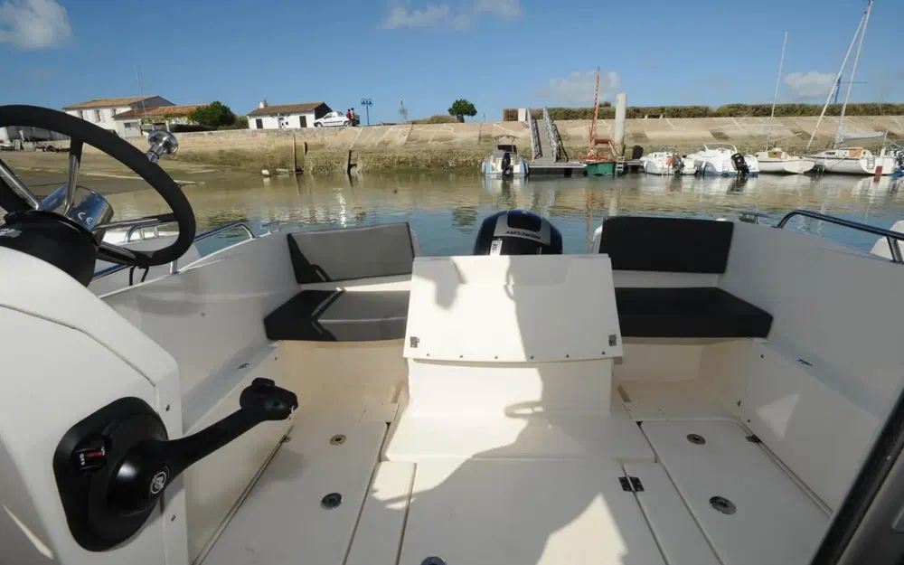 Une cuisine conçue avec soin (avec évier, robinet, rangement et possibilité d’installer un réfrigérateur ainsi qu’une cuisiniere) un coin WC marin séparé, une table avec 4 places assises ainsi qu’une grande baie vitrée sur le toit. Le pont n’est pas en reste permettant par exemple d’installer une banquette en U tout en offrant un bon espace pour la peche.