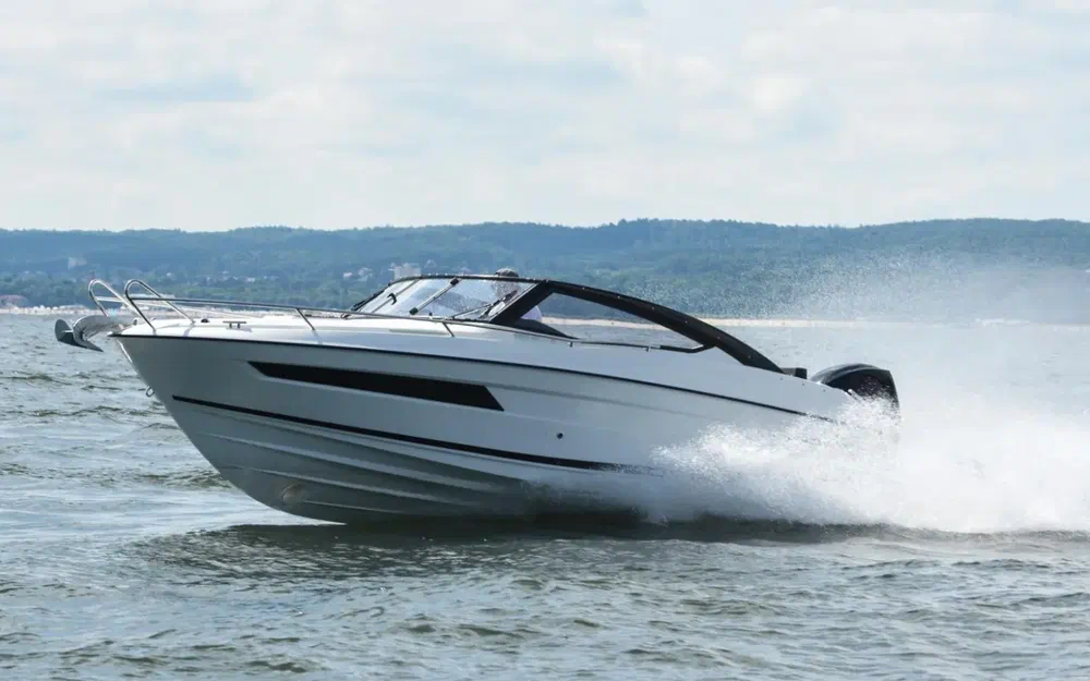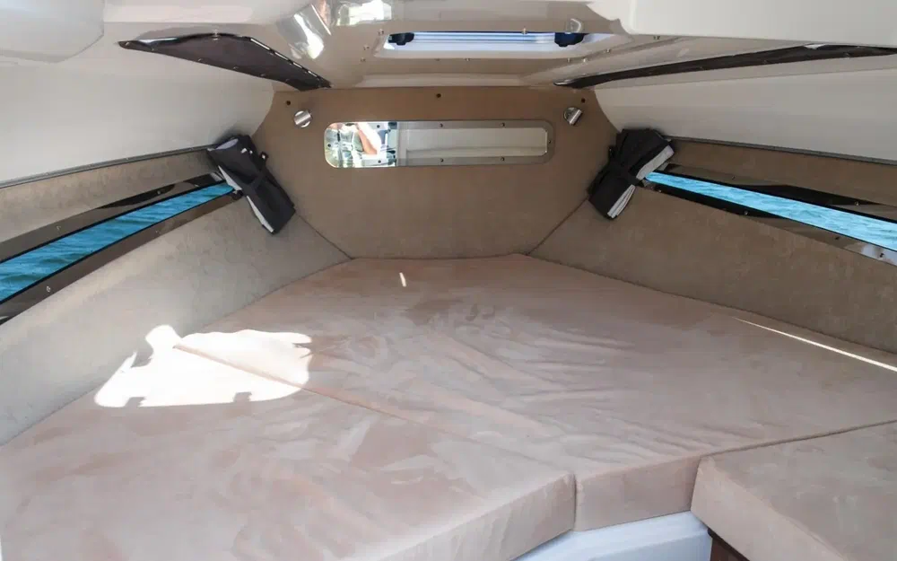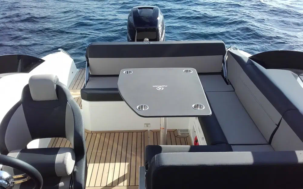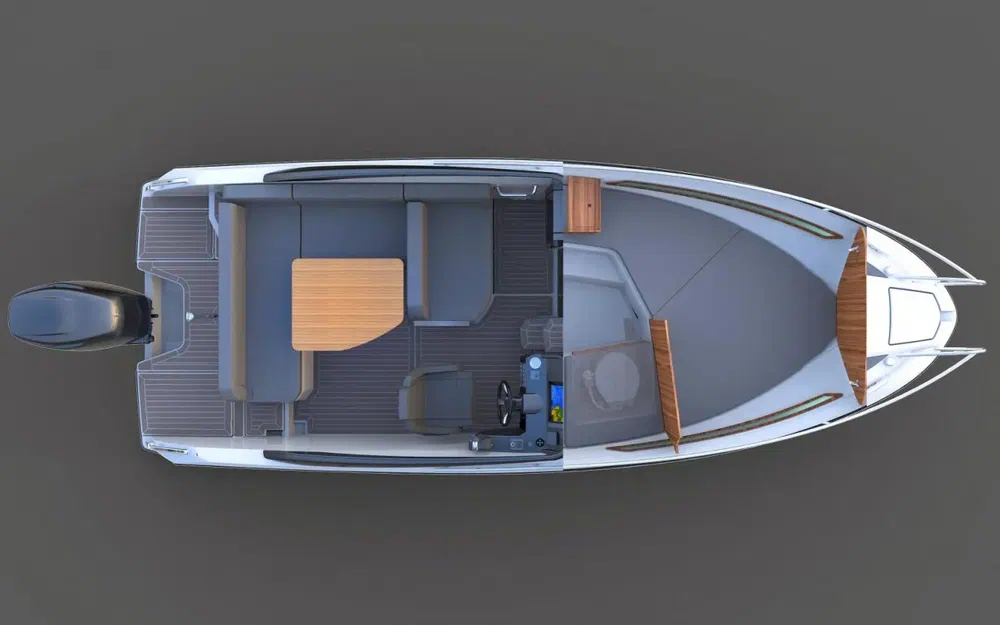 Ce bateau élégant et sportif de type Day Cruiser à été idéalement conçu pour des escapades à la journée ou pendant un week-end entre amis ou en famille. Le cockpit spacieux permet à 7 personne de prendre confortablement place sur cette unité grâce entre autre à sont canapé en forme de U. De plus la table une fois abaissé se transforme en bain de soleil, la banquette basculante quand à elle permet de profité pleinement des plages de bain. Le tableau de bord très élégant est mis en valeur de part sa couleur et les matériaux utilisé, trois marche éclairé permettent d'accéder au pont avant. Un réchaud ainsi qu’un evier est également disponible du côté bâbord. Une cabine à l’avant fermer permet à deux personnes de dormir à bord, un WC marin peux également être rajouté en option.