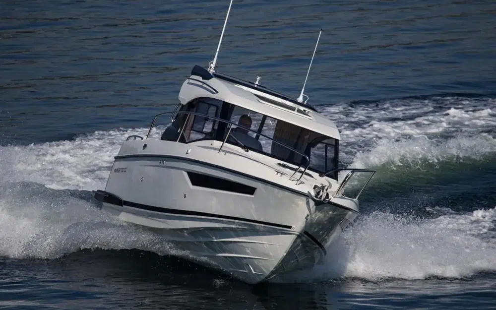 La coque stratifiée, révolutionnaire de ce nouveau bateau a été conçu pour atteindre des vitesses élevées, tout en gardant le confort d’une navigation optimale. En effet, elle est dotée d’un angle de coque précis et de multiples nervures : elle peut atteindre une vitesse de 35 nœuds avec un moteur de 150 CV, et 45 nœuds avec 250 CV.
