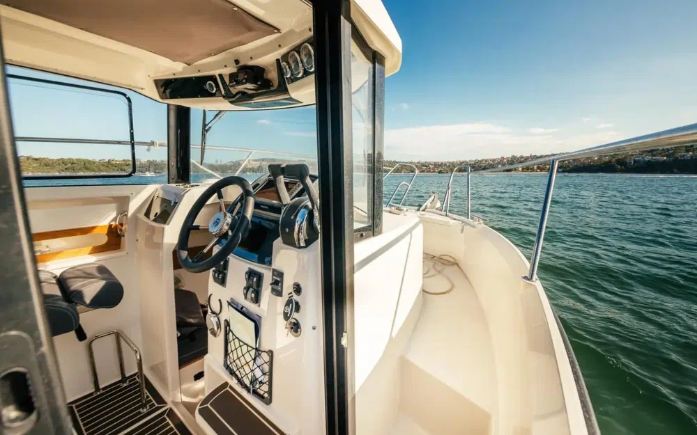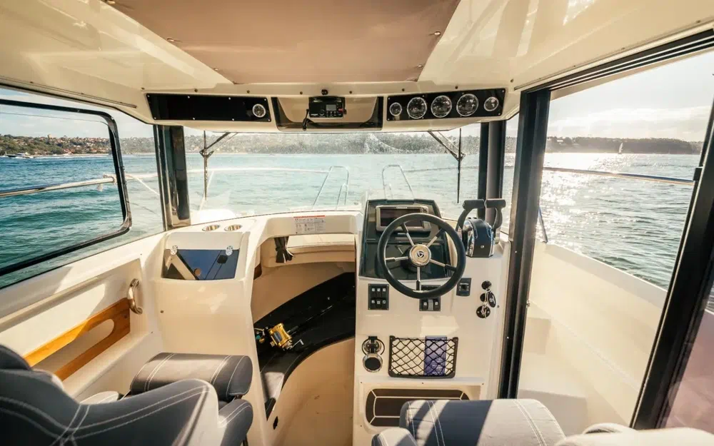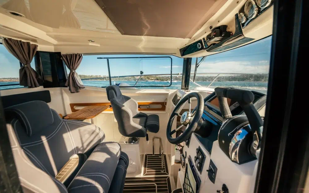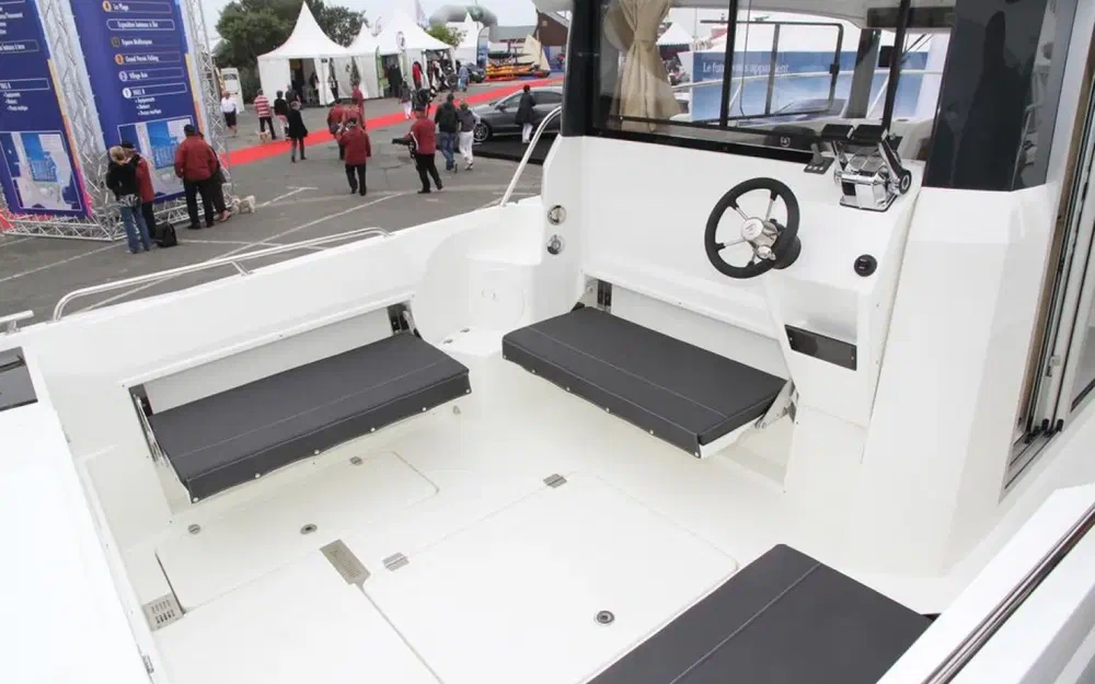 Sa cabine élégante désaxe côté bâbord offre une excellente visibilité et un séjour confortable sur le bateau ainsi qu’une navigation sure et fonctionnelle. Une double porte coulissante assure l’acces a la cabine (avec une porte supplémentaire a l’arriere, disponible en option) facilite les déplacement entre la cabine et le cockpit sans gené le pilote. De plus, la cabine est équiper d’un WC marin et d’une couchette. Nous trouvons également sous une banquette un évier ainsi qu’un réchaud.