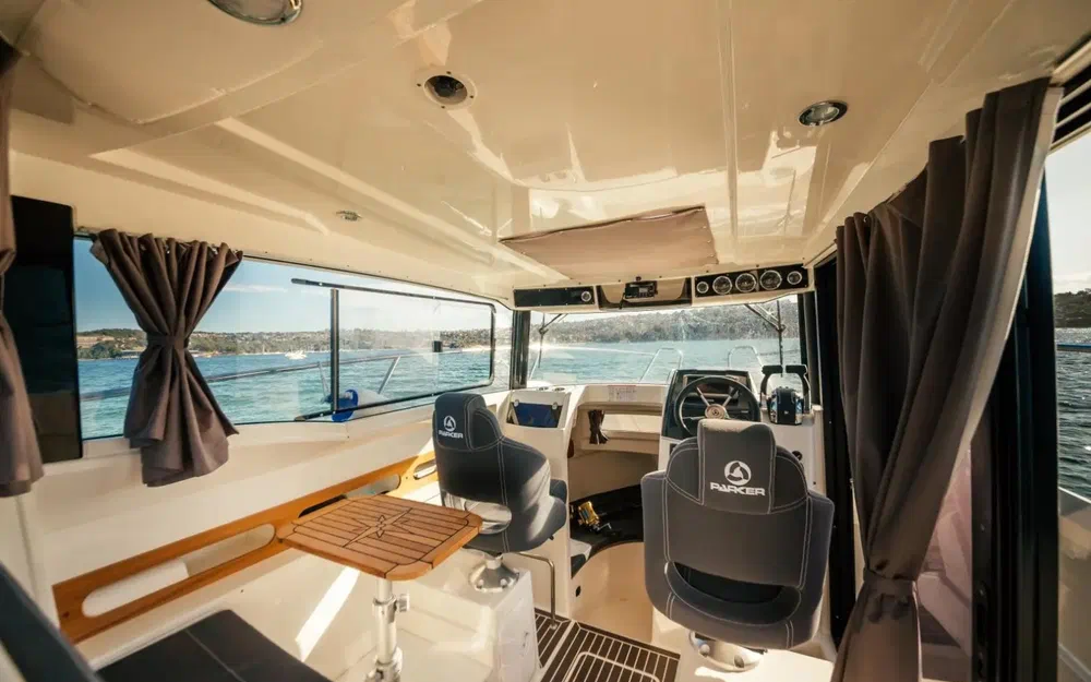 Le cockpit est un des plus grand de ce type de bateaux et permet d’accueillir juisqu’a 8 personnes, les banquettes se rabattent dans les franc bord afin de prendre un minimum de place .Un poste de commande supplémentaire, déja bien connu de tous les utilisateurs de bateaux Parker peut etre également installé.